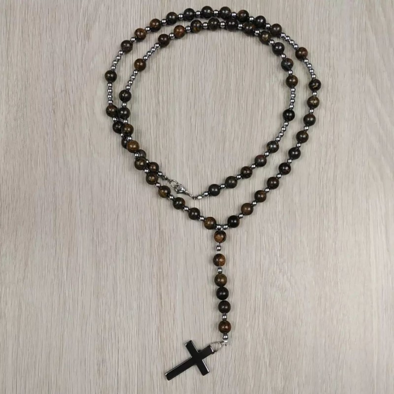 Różaniec naszyjnik wykonany z kamieni bronzyt i hematyt